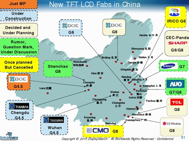 市場方面,隨著面板價格上揚、終端銷售成績比預(yù)期理想、中國家電下鄉(xiāng)及以舊換新政策的實施等,整個FPD產(chǎn)業(yè)景氣似乎已然復(fù)蘇,天馬、夏普、三星、LG等廠商陸續(xù)開始在大陸建立新生產(chǎn)線或重新啟動停產(chǎn)產(chǎn)能。
