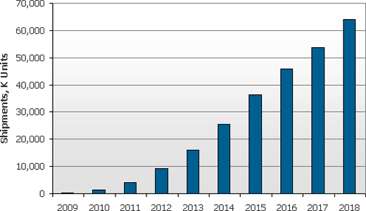 - 3D TV將由2009年的20萬(wàn)臺(tái)成長(zhǎng)到2018年的640萬(wàn)臺(tái)