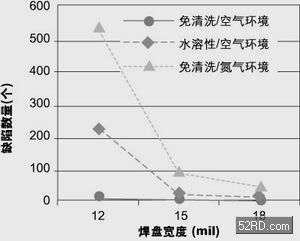 圖3是焊點(diǎn)不良與焊盤的寬度及組裝工藝的關(guān)系。這些數(shù)據(jù)是每種組裝工藝都選用最佳焊盤形式而得出的,試驗(yàn)時(shí)將焊盤的長度和焊盤間距設(shè)為常量,只對焊盤寬度進(jìn)行變化。通常來講,三種組裝工藝的良品率均隨焊盤寬度增大而提高,而不良率在焊盤寬度為0.012到0.015英寸之間較為敏感。水溶性焊膏在空氣環(huán)境中焊接和免清洗焊膏在充氮環(huán)境中焊接都是在焊盤寬度最大即0.018英寸時(shí)焊點(diǎn)缺陷最少,但這種情況在免清洗焊膏空氣環(huán)境下焊接時(shí)有一些改變,此時(shí)最高良品率是在焊盤寬度居中時(shí)(0.015英寸)得到的,然而由于使用這種工藝組裝的板子產(chǎn)生的不良數(shù)量非常少,所以焊盤寬度在0.015英寸和0.018英寸時(shí)不良數(shù)目之間的差異在統(tǒng)計(jì)上并不明顯。如果從組裝工藝的角度來看良品率變化趨勢,可以看到免清洗焊膏在空氣環(huán)境中焊接對焊盤寬度變化最不敏感,而免清洗焊膏在充氮環(huán)境下焊接工藝則對焊盤寬度變化最為敏感。