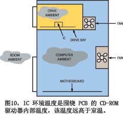 無疑,當(dāng)大多數(shù)工程師沒有理解環(huán)境溫度的嵌套程度時,他們就會失敗。例如,假設(shè)要設(shè)計(jì)一個部件,用于CD播放機(jī)的光學(xué)拾取裝置(圖10)。你可能會這么假設(shè),由于該部件用于消費(fèi)產(chǎn)品,它可能工作在0℃~70℃。但好好想想吧。實(shí)驗(yàn)室工作臺上的部件可能是工作在25℃環(huán)境下。而光功率件是要安裝在CD驅(qū)動器里,驅(qū)動器中有其它元件在加熱空氣,該裝置可能不裝風(fēng)扇。更糟糕的是,播放機(jī)裝在計(jì)算機(jī)內(nèi),驅(qū)動器必須工作在這種環(huán)境溫度下。計(jì)算機(jī)內(nèi)部有自己的熱源和風(fēng)扇,這個溫度上再加上外部環(huán)境溫度,因此,在工作臺上測得的25℃室溫,到了計(jì)算機(jī)內(nèi)就是40℃,CD驅(qū)動器內(nèi)是50℃?,F(xiàn)在,如果你把計(jì)算機(jī)放在厄瓜多爾的一個很熱的閣樓上,情況又該如何?這個部件必須工作在遠(yuǎn)高于70℃的環(huán)境溫度下。你的職責(zé)是確保它仍能滿足規(guī)范,并且高溫不會顯著縮短產(chǎn)品的壽命。
