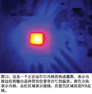 有關(guān)ESD二極管方法的另一個擔(dān)心是,IC芯片并不是等溫的,即它們在空間和時間上都不具備相等或恒定溫度。測量ESD二極管時并不能永遠(yuǎn)保證測到的是內(nèi)核的最熱點(diǎn)。這里關(guān)注的是ESD二極管,它總是在芯片的邊沿,低于輸出晶體管的溫度。你可以獲得IC工作時的IR熱成像圖(圖12)。圖中明亮的白點(diǎn)比ESD二極管所在的內(nèi)核邊沿高25℃。當(dāng)器件工作在高溫下時,可能需要降級使用(參考文獻(xiàn)8)。在150℃時,器件可能不能滿足電路的要求。