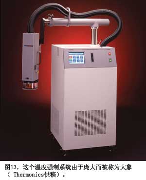 做測量只是檢查真實(shí)情況,驗(yàn)證自己的假設(shè)與估算的一個部分。如果沒有可用的環(huán)境溫度,你還必須自己創(chuàng)造出來。汽車公司會在亞利桑那州和加拿大做跟蹤測試,對于電子測試,采用臺面測試室或溫度強(qiáng)制系統(tǒng),如Thermonics的T-2500E型(圖13)。要確保使用的電纜和測試線可以承受熱量。BrownBNC電纜有較高的額定溫度,優(yōu)于更常用的黑色U58型線(參考文獻(xiàn)9)。熱風(fēng)槍的快速氣流就可以加熱IC,但要小心,IC可能很容易被熱風(fēng)槍毀壞。制