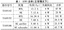 TexasInstruments還提供具有數(shù)字增益控制功能的RMS功率測量方式,使THD+N≤10%。利用TI公司的TAS5508或TAS5086型調(diào)制器,可以實(shí)現(xiàn)數(shù)字增益。THD+N為10%時(shí)的平均功率要高于正常FTC的THD+N<1%時(shí)的額定功率。表2列出了THD+N為10%時(shí)的平均功率。