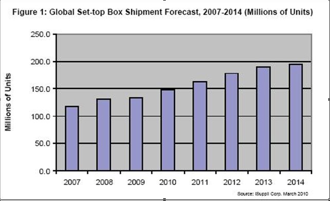 據(jù)iSuppli公司,機頂盒出貨量未來幾年將繼續(xù)增長。消費者收看模式發(fā)生轉變,通過互聯(lián)網(wǎng)提供的電視內容越來越流行,從而將為提供商創(chuàng)造條件,在數(shù)字家庭的激烈爭奪中獲得新的營業(yè)收入來源。