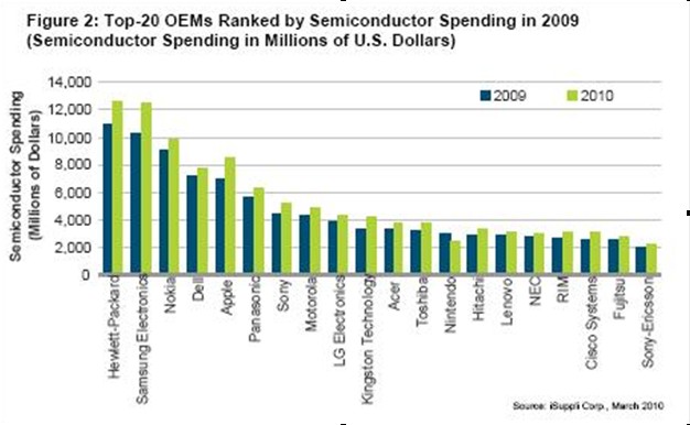 預(yù)計(jì)2010年惠普將是半導(dǎo)體支出最多的OEM廠商,它把諾基亞擠下去之后就一直保持這一位置。諾基亞2009年降到第三名。惠普今年的支出預(yù)計(jì)為126億美元,高于2009年時(shí)的109億美元。對于諾基亞來說,雖然智能手機(jī)大受歡迎,但2009年手機(jī)出貨量下降使其難以超過惠普,惠普依靠上網(wǎng)本而取得支出排行榜的第一名。