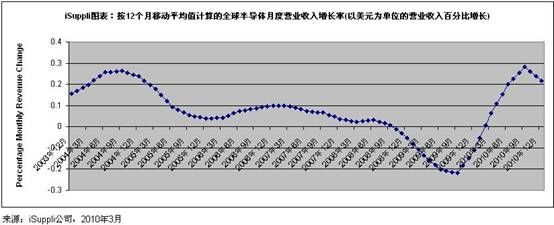 據(jù)iSuppli公司,按12個月移動平均值計算,2010年月度半導(dǎo)體營業(yè)收入將以史上最強勁的速度反彈。