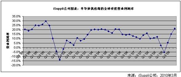 2009年第四季度,半導(dǎo)體供應(yīng)商的整體營業(yè)利潤率升至21.4%,為2000年第四季度達(dá)到24.7%以來的最高水平。由于全球經(jīng)濟(jì)衰退,半導(dǎo)體產(chǎn)業(yè)利潤率在2009年第一季度降到負(fù)5.3%,但隨后持續(xù)大幅反彈。下圖所示為2000至2009年半導(dǎo)體產(chǎn)業(yè)各季度利潤率情況。