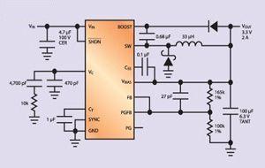 在猝發(fā)模式下,它的靜態(tài)電流低于100礎(chǔ),適合輸入電壓為12V至3.3V的產(chǎn)品。這個器件采用厚度很薄的TSSOP封裝,熱阻非常小,適合尺寸很小的設(shè)計。最后,它使用了電流模式電路,具有良好的瞬態(tài)響應(yīng),容易補償,并且使用一種擁有專利權(quán)的電路,在占空比為任何數(shù)值時保持開關(guān)中的峰值電流恒定。它的開關(guān)頻率是固定的200kHz,此外,這個產(chǎn)品可以同更高的頻率同步。在整個汽車的溫度范圍內(nèi),它的穩(wěn)壓性能很好,并且提供電源正常信號/復(fù)位、軟啟動和UVLO功能。這個電路是一個可靠的、高效率的降壓轉(zhuǎn)換器解決辦法,電流高達2.5A,尺寸很小,適合汽車使用。