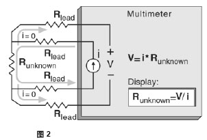四線歐姆法是測量小電阻的最精確方法。用這種方法能自動扣除測試線電阻和接觸電阻。四線電阻測量連接見圖2。使用一個已知電流源和測量電阻器產(chǎn)生的電壓,就能計算出未知電阻值。一組附加測試線用來承載至未知電阻器的電流,在它上面產(chǎn)生的電壓可通過電壓感應(yīng)線測量。沒有電流流過電壓感應(yīng)線,因此它也不會產(chǎn)生電壓降。