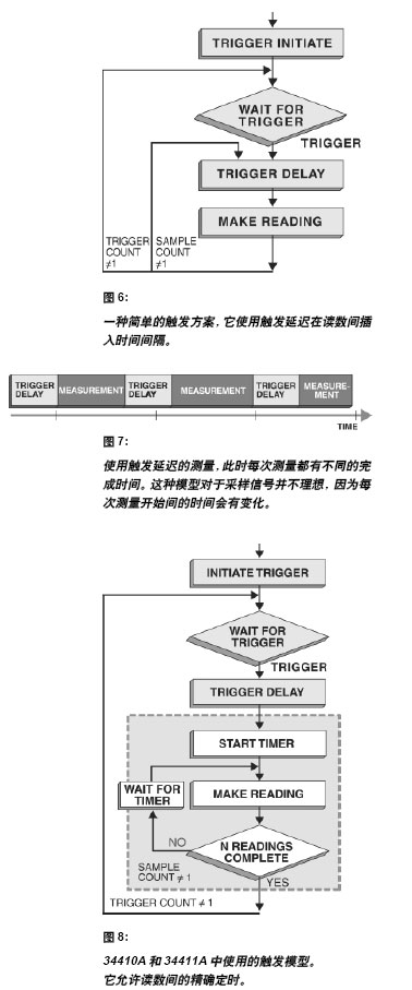 圖8示出第二種觸發(fā)模型。這是在34410A、34411A 和3458A 中使用的模型。它允許獨立設(shè)置觸發(fā)延遲和采樣間的時間。此外,用采樣環(huán)(n個讀數(shù))可更快地得到讀數(shù)和實現(xiàn)最小的時間變動量。大多數(shù)采樣環(huán)在硬件中實現(xiàn),由最少的固件