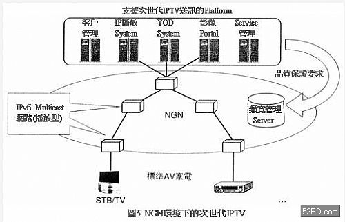 實(shí)現(xiàn)次世代IPTV服務(wù)必需與可作QoS控制的次世代網(wǎng)路(NGN)整合。如圖5所示NGN與次世代IPTV系統(tǒng)整合,藉此建立次世代IPTV全新服務(wù)的要件。
