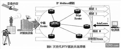 圖6是次世代IPTV播放系統(tǒng)架構(gòu),如圖所示IPTV播放系統(tǒng)透過(guò)送出設(shè)備的IPMulticast傳送節(jié)目,收訊機(jī)端消費(fèi)者的選臺(tái)操作,可以使該傳輸該節(jié)目的MulticastStream收訊再生。