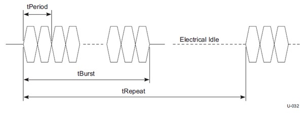 測量了Polling.LFPS信令的電壓和時間參數(shù),在USB3.0規(guī)范CTS Rev0.9中是必測項目。測試方法為:待測試產(chǎn)品(PUT)的端口上插入USB3.0夾具,夾具上的TX端通過同軸電纜連接到示波器的兩個通道,將PUT上電后,PUT會發(fā)送出Polling.LFPS信令,示波器捕獲后測量其水平或垂直參數(shù)。如圖3所示為LFPS的信號特征。在力科一致性測試軟件中會分析脈沖的上升、下降時間、周期、占空比、峰峰值、共模電壓,以及脈沖串的突發(fā)持續(xù)時間(tBurst)和重復(fù)時間(tRepeat)。