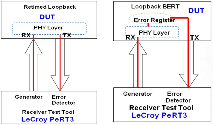 對于USB3.0的接收機(jī)測試還可以使用另一種方法:即Loopback BERT Method。如下圖7的右圖所示:DUT的接收端工作在Loopback BERT模式,直接分析BERT發(fā)送出的已知的測試碼流,對接收到的誤碼計數(shù),誤碼數(shù)量存入誤碼寄存器(如下圖7的Error Register),LeCroy PeRT3直接讀取誤碼寄存器,得到誤碼率和抖動容限測試結(jié)果。