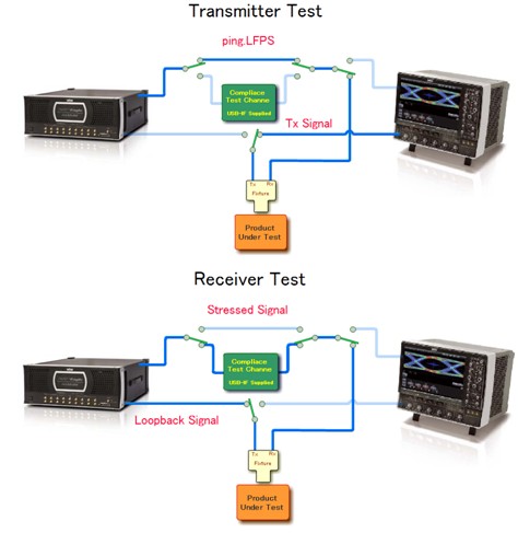 在RX測試時,示波器通過GPIB接口控制RF Switch切換到另一鏈路,如圖8下部分所示,PeRT3的碼型發(fā)生器輸出的加入抖動的信號先通過Compliance Test Channel(由Intel的11英寸背板和3米USB3.0電纜組成),然后連接到USB3夾具,進(jìn)入PUT的RX端,PUT的TX端通過夾具,把信號發(fā)送給PeRT3的Error Dector端。