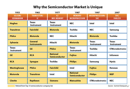 晶體管的領導者。在1960年代, 能夠維持增長并領先是依靠雙極型集成電路技術, 在該10年中, 排在前10名中的公司有40%消失, 而到1970年代,其中的80%也消失了。在70年代時, 是依靠MOS存儲器來推動增長, 當時日本有三家公司,NEC,Hitachi及Toshiba進入前10。到1980及1990年代, 排在首位是依靠微處理器, 如英特爾與Motorola。在1990年代, 情況有所變化, SoC的領導者, 如STMicroelectronics及TI進入前10。而到最近10年中,fabless公司如Qualcomm及代工大亨TSMC進入前10中。