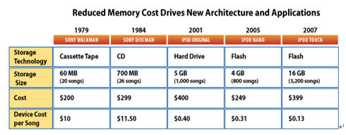 在如此高的累積數量增長下推動學習曲線的成本下降,在過去10年中每年晶體管的成本下降35%及總體上能使新的應用市場達到規(guī)?;H?001年的MP3播放機的價格與今天的攝像機相同, 而今天攝像機中用的存儲器容量增長了10倍, 而且與2001年時的尺寸及功耗幾乎相同。