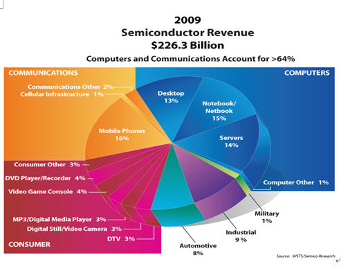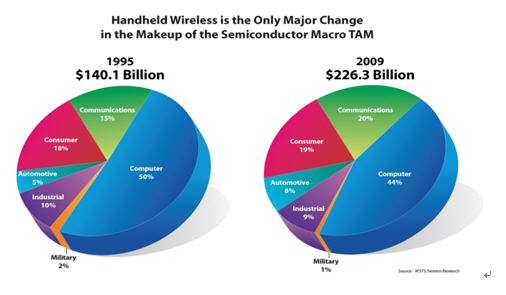 那么未來將會是怎么樣呢?只要晶體管的數量按目前的高增長倍率繼續(xù)走下去,各種新的應用會層出不窮,推動半導體市場總量進一步提高。因此全球半導體市場在近15年來看似十分穩(wěn)定,雖然如臺式計算機市場已經飽和,但是筆記本電腦和上網本開始流行,加上消費類電子產品如游戲機,平板電視,MP3, 數碼相機等, 由于半導體含量的增加推動了半導體TAM的增加。