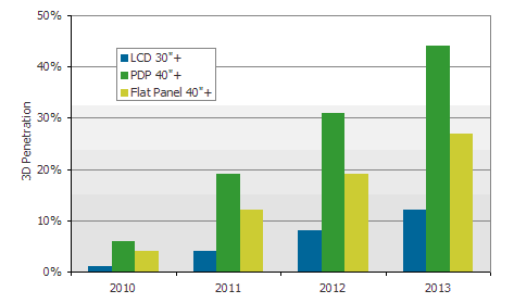 Paul指出3D電視剛開始以大尺寸產(chǎn)品為主,同時需要結(jié)合如藍(lán)光DVD與3D數(shù)字廣播系統(tǒng)等才有機(jī)會引發(fā)消費(fèi)者購買,因此預(yù)估今年主要出貨將以北美市場為主,北美將占有全球超過50%出貨量。另外與其它機(jī)種比較,具備3D功能的影像處理器與增加顯示功能方案成本都非常昂貴,也因此3D市場成長將受限于倍頻與雙倍頻機(jī)種的滲透率。DisplaySearch預(yù)估到了2013年3D電視占所有40寸及以上尺寸電視出貨量比率將僅有27%。除了成本因素外,西歐地區(qū)目前藍(lán)光DVD與高清播放系統(tǒng)滲透率仍低,如此一來對于3D內(nèi)容提供形成一定障礙,也對于3D電視成長造成一些影響。