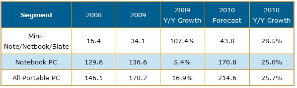 隨著平板電腦市場加溫,DisplaySearch以為2010年上網(wǎng)本及平板電腦將是最快速成長的應(yīng)用別。同時(shí)由于開發(fā)中國家需求增加與下半年商用市場復(fù)蘇,傳統(tǒng)翻蓋式筆記本電腦也將持續(xù)增長。對于2010年全球筆記本電腦市場總量估計(jì)可達(dá)2億1千5百萬臺,年增長率為25.7%。