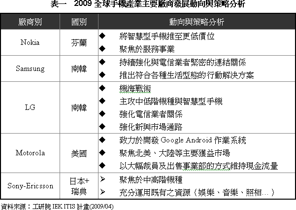 受金融風(fēng)暴影響,2009年全球手機市場衰退已成定局,為了因應(yīng)詭譎多變的局勢,前五大手機品牌業(yè)者紛紛調(diào)整其市場策略,Nokia以完整布局求穩(wěn)定發(fā)展,Motorola與Sony-Ercisson則主要以撙節(jié)開銷的方式熬過寒冬,相較之下韓系業(yè)者則以較為積極的方式進行布局。