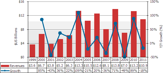 今年許多擴(kuò)廠及新建的Fab廠計劃設(shè)備將在2011年設(shè)置完成,但相對也埋下一些隱憂,屆時產(chǎn)能全部開出時,需求成長率將必須維持在高點,否則將有供過于求的風(fēng)險。
