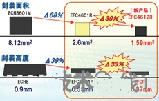 后者的封裝采用了兩項扁平化技術(shù)。一是改變了焊錫球的形狀。從原來的球狀改為了半球狀,高度降低了120μm。第二項是封裝背面的保護膜技術(shù)。將Si部分的高度比原產(chǎn)品降低80μm,并為確保強度而在背面粘貼了20μm的保護膜。這減少了60μm的高度。兩項技術(shù)加起來,此次將高度從已有的EFC4601R的550μm降低了33%至370μm。