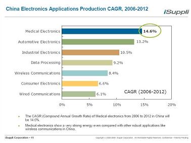 “醫(yī)療電子市場的年復(fù)合增長率在所在領(lǐng)域中最高,達14.6%,超過目前也是很火的汽車電子、無線通信等領(lǐng)域,所以大家可以想象它為什么吸引眾多觀眾。”iSuppli資深分析師王仁震解釋,“而中國醫(yī)療電子市場占全球的比例也是逐年增長,2006年只占到4%,但2013年可達到9%的比重。”