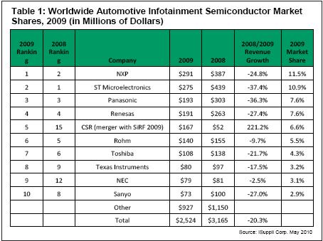 顯然,2009年汽車產(chǎn)業(yè)衰退導(dǎo)致總體市場遭受嚴重打擊,總體專用半導(dǎo)體營業(yè)收入比2008年的32億美元下降20%,僅略高于25億美元。供應(yīng)鏈中的多數(shù)廠商營業(yè)收入下降20-35%,甚至大型知名半導(dǎo)體廠商亦發(fā)生虧損。日本汽車產(chǎn)量下降近34%,歐洲/中東/非洲(EMEA)地區(qū)產(chǎn)量罕見地下降23%,美國汽車產(chǎn)量亦下降25%,導(dǎo)致信息娛樂半導(dǎo)體受到打擊。