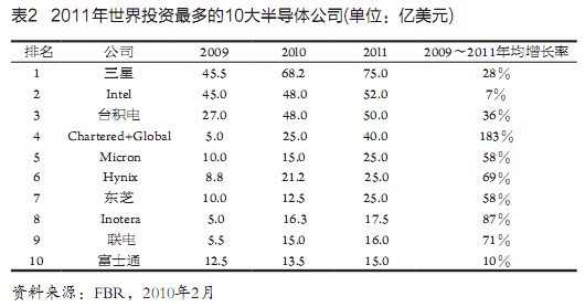又據(jù)FBR市場(chǎng)調(diào)研公司發(fā)表的報(bào)告,世界半導(dǎo)體業(yè)的總投資額2009~2011年分別為257億美元、406億美元和495億美元,和Gartner公司所報(bào)基本相同。該公司又稱,這3年世界最大25家半導(dǎo)體公司的投資,占到整個(gè)半導(dǎo)體業(yè)投資的近90%。2009~2011年世界投資最多的l0家半導(dǎo)體公司如表2所示。