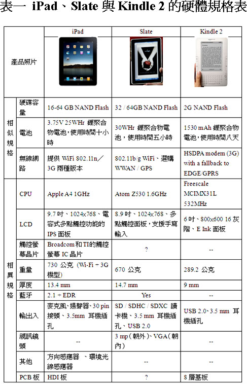平板電腦iPad、Slate以及電子書(shū)閱讀器Kindle 2的硬體規(guī)格表如表一所示,從此表的硬體規(guī)格資料中,我們可以得知,iPad、Slate和Kindle 2采用的硬體規(guī)格有其相似處,也有其相異之處。