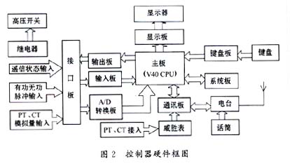 該終端控制器的硬件結(jié)構(gòu)如圖2所示,它的主體是一臺(tái)STD工控機(jī),采用模板式結(jié)構(gòu),便于故障檢修。供電線路的電壓、電流經(jīng)PT、CT變換后經(jīng)A/D轉(zhuǎn)換板轉(zhuǎn)變?yōu)閿?shù)字信號(hào)送至V40主板,PT、CT變比經(jīng)主臺(tái)設(shè)定后下發(fā)至該終端,CPU據(jù)此計(jì)算出線路的實(shí)際電壓、電流。脈沖電度表發(fā)出的脈沖信號(hào)經(jīng)輸入板送至CPU,根據(jù)電表脈沖常數(shù)計(jì)算出有功及無功功率。KG105型電臺(tái)接收主臺(tái)下發(fā)的指令,經(jīng)通訊板送至CPU,然后由輸出板控制輸出繼電器的動(dòng)作,進(jìn)而實(shí)現(xiàn)遙控跳合閘操作。遠(yuǎn)程抄表是由電臺(tái)經(jīng)通訊板采集威勝表中的數(shù)據(jù)實(shí)現(xiàn)的,而召測(cè)數(shù)據(jù)則是采集CPU中計(jì)算出的數(shù)據(jù)。CPU每隔1min采集1次數(shù)據(jù),所有計(jì)算結(jié)果保存在系統(tǒng)板上的SRAM中,可保存24小時(shí)的數(shù)據(jù),因此主臺(tái)第二天必須將第一天的數(shù)據(jù)召測(cè)回中心站的數(shù)據(jù)庫中,否則第一天的數(shù)據(jù)將丟失。