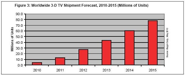 3D電視3月首次上市,由于日益受到歡迎以及早期接受者的接納,預(yù)計(jì)2010年全球出貨量將達(dá)到420萬(wàn)臺(tái)。2011年全球3D電視出貨量將是今年的三倍,達(dá)到1290萬(wàn)臺(tái),2012年再增長(zhǎng)一倍達(dá)到2740萬(wàn)臺(tái)。
