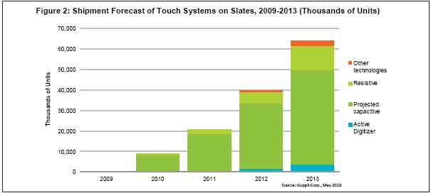 最近幾年,個人電腦市場對于觸摸屏的需求不斷增長,2008和2009年增長率超過20%,快于總體系統(tǒng)市場。但與該市場2010年462%的增長率相比,上述增長速度就相形見絀了。平板觸摸電腦是PC觸摸革命中的主要初期推動者,預(yù)計占PC觸摸市場的比例將從2009年的3.8%銳升到56.2%,而總體PC觸摸市場規(guī)模將擴大兩倍。