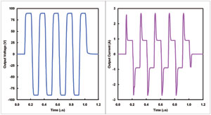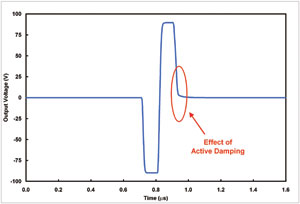 我們可以直觀地理解超聲波發(fā)送器輸出的對稱性要求。然而,這里需要深入理解的是輸出信號不必為一個長脈沖群。它可能包括一個單正極和負(fù)極脈沖對,脈沖對的前后均為0V。同樣,信號歸至0V的質(zhì)量變得至關(guān)重要。有時,它被稱為“阻尼”函數(shù)(見圖3),并對一些超聲波模式產(chǎn)生巨大的影響,例如,人體非線性為主要信息源的諧波成像等。