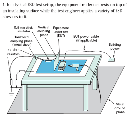 對(duì)于小型產(chǎn)品來(lái)說(shuō),工程師經(jīng)常在專(zhuān)門(mén)的測(cè)試環(huán)境中執(zhí)行系統(tǒng)級(jí)ESD測(cè)試(圖1)。對(duì)IEC61000-4-2測(cè)試而言,這些測(cè)試環(huán)境包括:地板上的金屬接地板、木桌、放在桌子上的金屬水平耦合板(到接地板有個(gè)0.95米長(zhǎng)的連線,在水平耦合板之上的一個(gè)0.5mm絕緣層)。