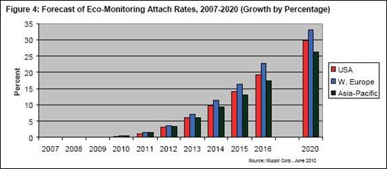 上述每類應(yīng)用的汽車配售率預(yù)計都會增長,2010-2013年增長比較緩慢,隨后從2014年開始基本以兩位數(shù)的速度增長,直到2020年末。iSuppli公司的圖表顯示,節(jié)能監(jiān)測和節(jié)能建議近期將大幅增長,而由于復(fù)雜性和需要與其它汽車系統(tǒng)整合,節(jié)能動力總成的布署比較緩慢。但到2020年,美國和西歐的節(jié)能動力總成應(yīng)用將達到35%的配售率,接近節(jié)能監(jiān)測和節(jié)能建議系統(tǒng)的水平。