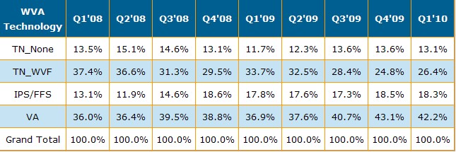 根據(jù)最新發(fā)布的 DisplaySearch Quarterly Wide Viewing Angle Technology Report, (DisplaySearch季度廣視角技術(shù)出貨報告) , VA(Vertical Alignment)型廣視角技術(shù)的面板出貨在所有LCD視角技術(shù)的出貨中取得領(lǐng)先,以出貨面積計算, VA型出貨占了2010年第一季全球所有面板出貨的43.5%(如以下附表所示)。而在各種不同的視角技術(shù)當中,VA(Vertical Alignment)型廣視角技術(shù)的面板出貨從2008年第一季的36%持續(xù)成長到2010年第一季的43.5%,目前在面板廠的布局上,LG Display, IPS Alpha 與BOE采取了 IPS (In Plane Switching)與FFS(Fringe-field switching)的技術(shù),其余LCD TV面板生產(chǎn)廠商在32寸及以上的LCD TV面板采用了VA(Vertical Alignment)型廣視角技術(shù)。