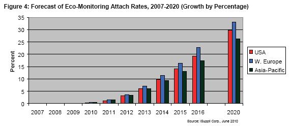 上述每類應(yīng)用的汽車配售率預(yù)計都會增長,2010-2013年增長比較緩慢,隨后從2014年開始基本以兩位數(shù)的速度增長,直到2020年末。iSuppli公司的圖表顯示,節(jié)能監(jiān)測和節(jié)能建議近期將大幅增長,而由于復(fù)雜性和需要與其它汽車系統(tǒng)整合,節(jié)能動力總成的布署比較緩慢。但到2020年,美國和西歐的節(jié)能動力總成應(yīng)用將達到35%的配售率,接近節(jié)能監(jiān)測和節(jié)能建議系統(tǒng)的水平。
