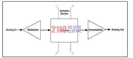 在一個(gè)理想的隔離放大器中,其模擬輸出信號(hào)與模擬輸入信號(hào)完全相同。圖7中標(biāo)記為“隔離”的部分采用了之前章節(jié)中討論的技術(shù)(光耦合、電容耦合或感應(yīng)耦合)之一,以跨過(guò)隔離層傳遞信號(hào)。調(diào)制器電路為隔離電路對(duì)信號(hào)進(jìn)行預(yù)處理。對(duì)于光學(xué)耦合方法,您需要對(duì)該信號(hào)作量化處理,或?qū)⑵滢D(zhuǎn)換為變化的光強(qiáng)。對(duì)于電容耦合方法和感應(yīng)耦合方法,您需要將該信號(hào)轉(zhuǎn)換為變化的電場(chǎng)或磁場(chǎng)。然后,解調(diào)器電路讀入隔離電路的輸出,并將其轉(zhuǎn)化回最初的模擬信號(hào)。
