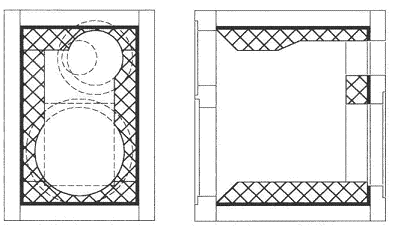 本音箱的箱體制作比較簡(jiǎn)單,只需按圖6所示將.6塊具有相應(yīng)開(kāi)口的箱板緊固在一起即可,無(wú)需使用加強(qiáng)板或支柱。高音單元裝在偏離面板中央的位置和前面板兩側(cè)倒成圓角是為了獲得正確輻射方向因而采取的措施。此外,與通常的做法相比,低音反射口不是位于前面板而是位于箱體背后。該反射口內(nèi)接的出聲管可用直徑35mm、長(zhǎng)123mm稍具錐度的聚氯乙烯塑料管制成。