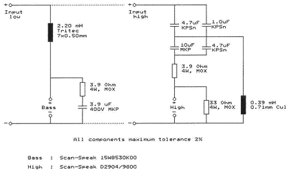 如果允許低音范圍的聲壓級(jí)低于100dB,則可使用一只口徑較小的低音單元。在這樣低的聲壓級(jí)下通常難以使低頻響應(yīng)下潛到50Hz以下,但本音箱使用的Scan-Speakl5cm低/中音單元在低頻下卻能產(chǎn)生足夠的聲輸出并能令人滿(mǎn)意地重放2kHz-3kHz的聲音,這樣就不必使用中音單元了。某些口徑較小的低音單元設(shè)計(jì)成能在較小的音箱中令人非常滿(mǎn)意的重放低音,本音箱使用的低/中音單元就是一個(gè)很好的例證。