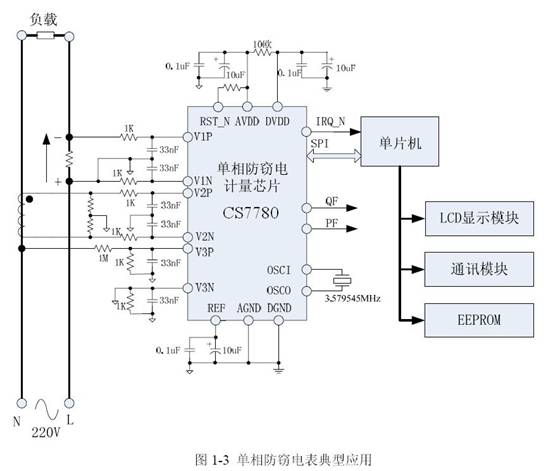 圖1:基于芯海CS7780芯片的單相防竊電電表典型應用。