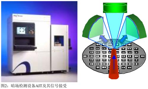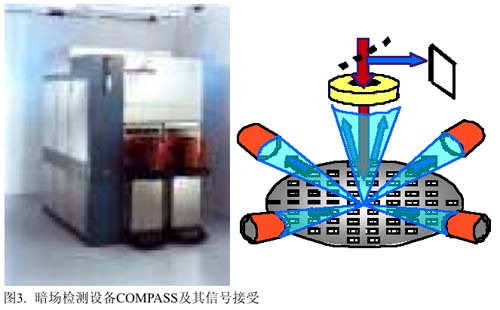 暗場(chǎng)檢測(cè)技術(shù)作為檢測(cè)晶片缺陷的有效手段之一,其優(yōu)點(diǎn)在于以下幾個(gè)方面:首先,在暗場(chǎng)獲得圖像的灰階易于控制和調(diào)節(jié)。暗場(chǎng)是位于硅片上方和硅片成30度角的區(qū)域,在此區(qū)域內(nèi)獲得的圖像灰階,可以通過(guò)調(diào)節(jié)激光的能量和探測(cè)器的敏感度來(lái)輕松控制;其次,在暗場(chǎng)內(nèi),可以很容易地辨認(rèn)有具體形態(tài)和位于硅片表面的缺陷,比如刮傷、微粒之類的缺陷;最后,使用暗場(chǎng)的檢測(cè)速度非常快,成本相對(duì)比較低,通常被用作快速分析影響產(chǎn)量的各類缺陷超出界定值的問(wèn)題,AIT和COMPASS是在半導(dǎo)體制造企業(yè)廣泛應(yīng)用的暗場(chǎng)檢測(cè)設(shè)備(如圖2和3所示)。[page]