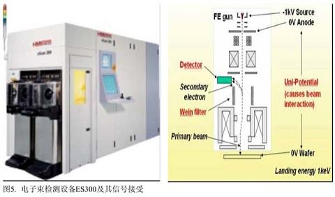 首先,它擺脫了照明光源,檢測(cè)結(jié)果不會(huì)受到類似變色、厚度不均等各種層面所帶來(lái)的物理因素的影響;其次,電子束的分辨率極高。因?yàn)樗臋z測(cè)單位是電子,電子要比微波以及任何尺寸的顆?;蛉毕荻家〉枚?;再次,電子是帶有電性的電荷,所以它可以被用于分析材料的電性或電組織成分,這被稱作電壓對(duì)比度圖像,經(jīng)常被用于檢測(cè)類似開(kāi)閉鎖等電子電路缺陷和通孔蝕刻不足等材料缺陷。電子束檢測(cè)設(shè)備一般有KLA-Tencor和HMI公司的Escan系列(如圖5所示)。