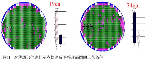 最終的實(shí)驗(yàn)證明自動(dòng)工藝檢測(cè)結(jié)果與最終良率的對(duì)應(yīng)關(guān)系。表明自動(dòng)工藝檢測(cè)可以反映存儲(chǔ)單元內(nèi)接觸孔通孔刻蝕的狀態(tài)。對(duì)于在生產(chǎn)線上檢驗(yàn)到薄弱部位有刻蝕不完全比較多的晶圓,其對(duì)應(yīng)的正常存儲(chǔ)單元內(nèi)也有較多的接觸孔有刻蝕不完全問(wèn)題??梢酝ㄟ^(guò)對(duì)產(chǎn)品的薄弱部位進(jìn)行監(jiān)測(cè)達(dá)到對(duì)正常存儲(chǔ)單元內(nèi)接觸孔刻蝕狀態(tài)的實(shí)時(shí)反映,這對(duì)接觸孔的刻蝕工藝改進(jìn)有極大的促進(jìn)作用(如圖11所示)。