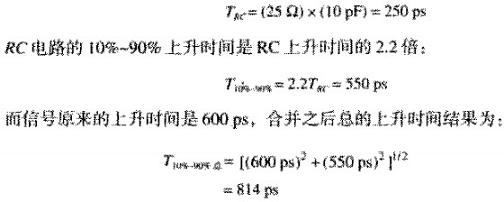 如第三個(gè)波形所示,當(dāng)連接的串聯(lián)電感很小時(shí),探頭等效于一個(gè)簡(jiǎn)單的電容負(fù)載。圖3.12所示的測(cè)試點(diǎn)等效信號(hào)源端阻抗為25歐,當(dāng)耦合到10PF的容性負(fù)載時(shí),其RC上升時(shí)間是: