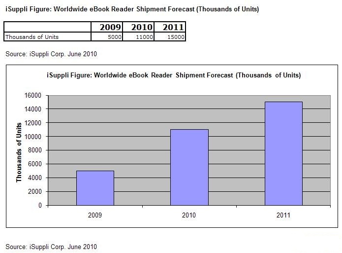 短期內(nèi),當電子書閱讀器的價格壓低到iPad起始價格點的一半左右時,可能會吸引消費者購買電子書閱讀器。不過,長期來看,電子書閱讀器仍可能有著比最初預期的更多利基。iSuppli預測,全球電子書閱讀器出貨量在2010年將達1,100萬部,2011年還可望成長120%,達到1,500萬部。