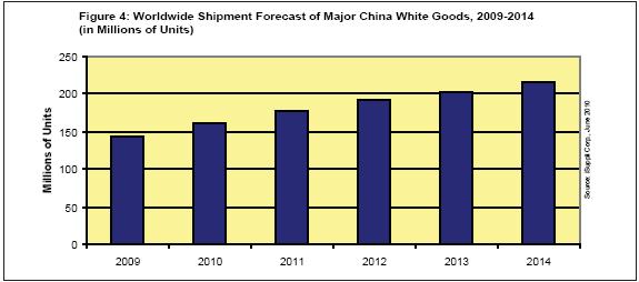 圖4所示為iSuppli公司對2009-2014年中國白色家電市場三種主要產(chǎn)品的出貨量預測。