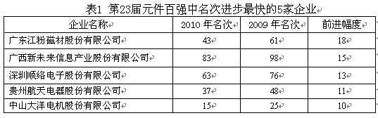 金融危機(jī)造成的企業(yè)經(jīng)營(yíng)上的波動(dòng)都反饋到了第22屆、23屆元件百?gòu)?qiáng)的榜單上。在近兩屆的榜單之中,均有20多家企業(yè)的名次出現(xiàn)了10位以上(含10位)的較大波動(dòng),去年23家,今年21家。據(jù)估計(jì),如果國(guó)際國(guó)內(nèi)的經(jīng)濟(jì)形勢(shì)能保持穩(wěn)定,在未來(lái)一兩年內(nèi),元件百?gòu)?qiáng)榜單中,名次出現(xiàn)大起大落的企業(yè)數(shù)量將會(huì)減少。